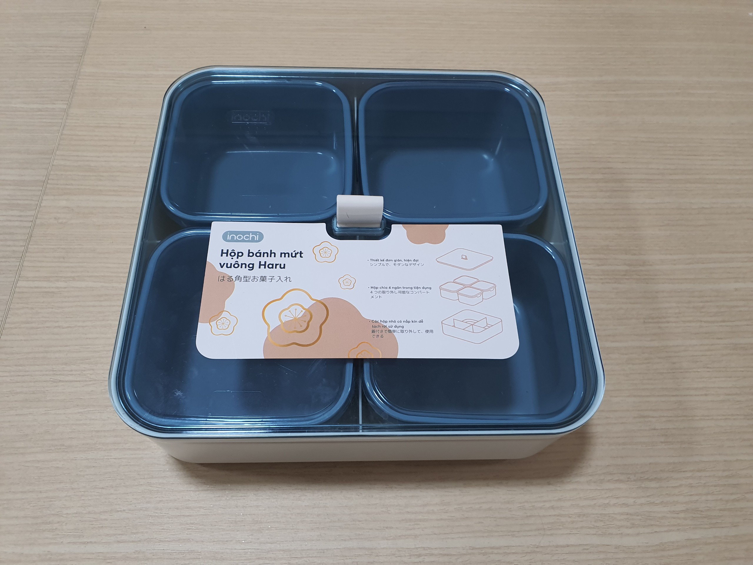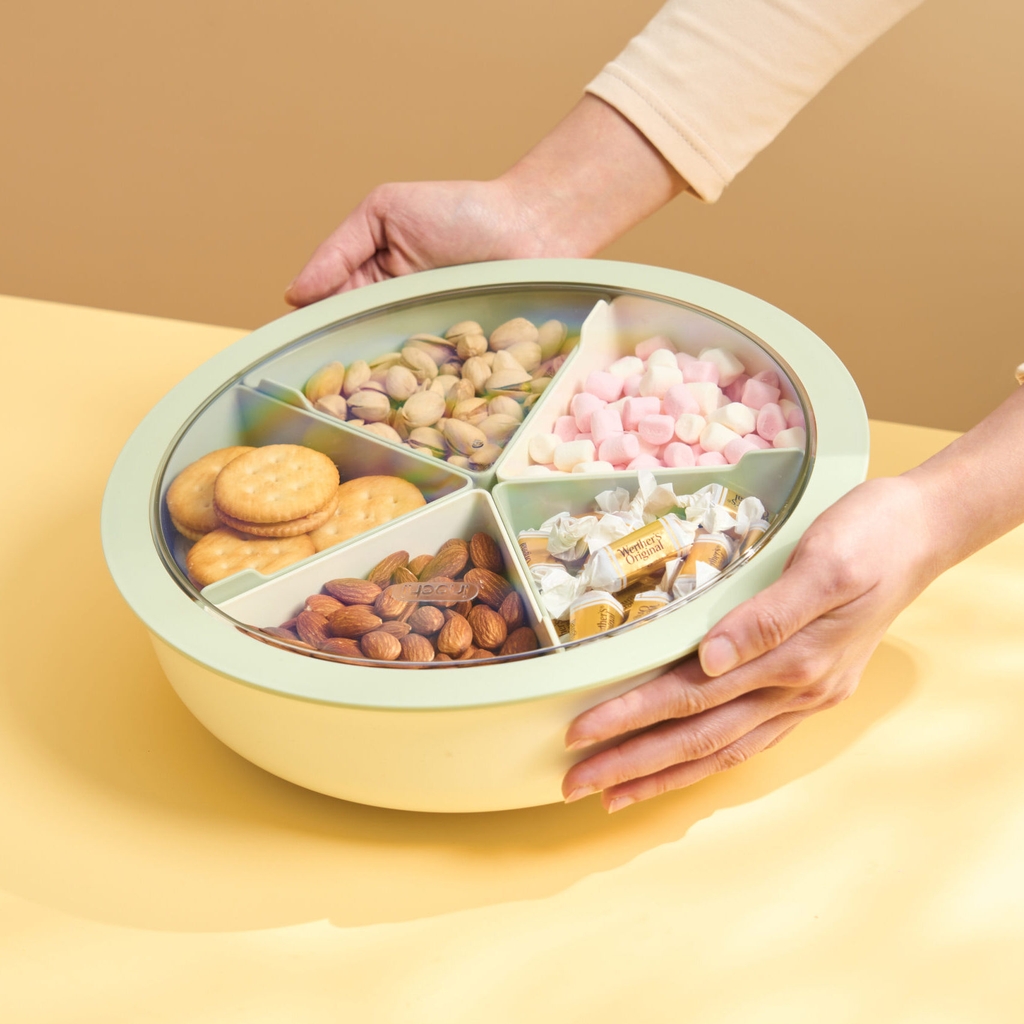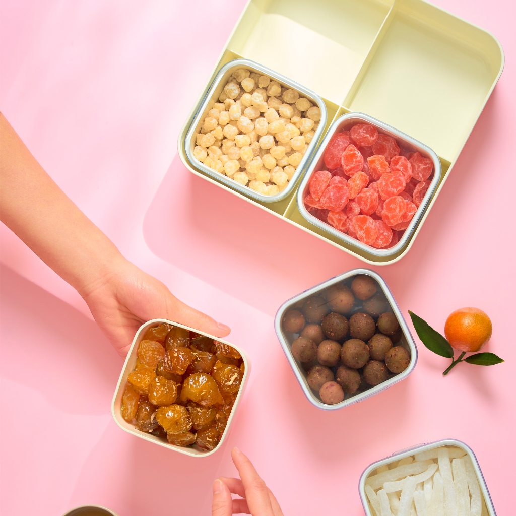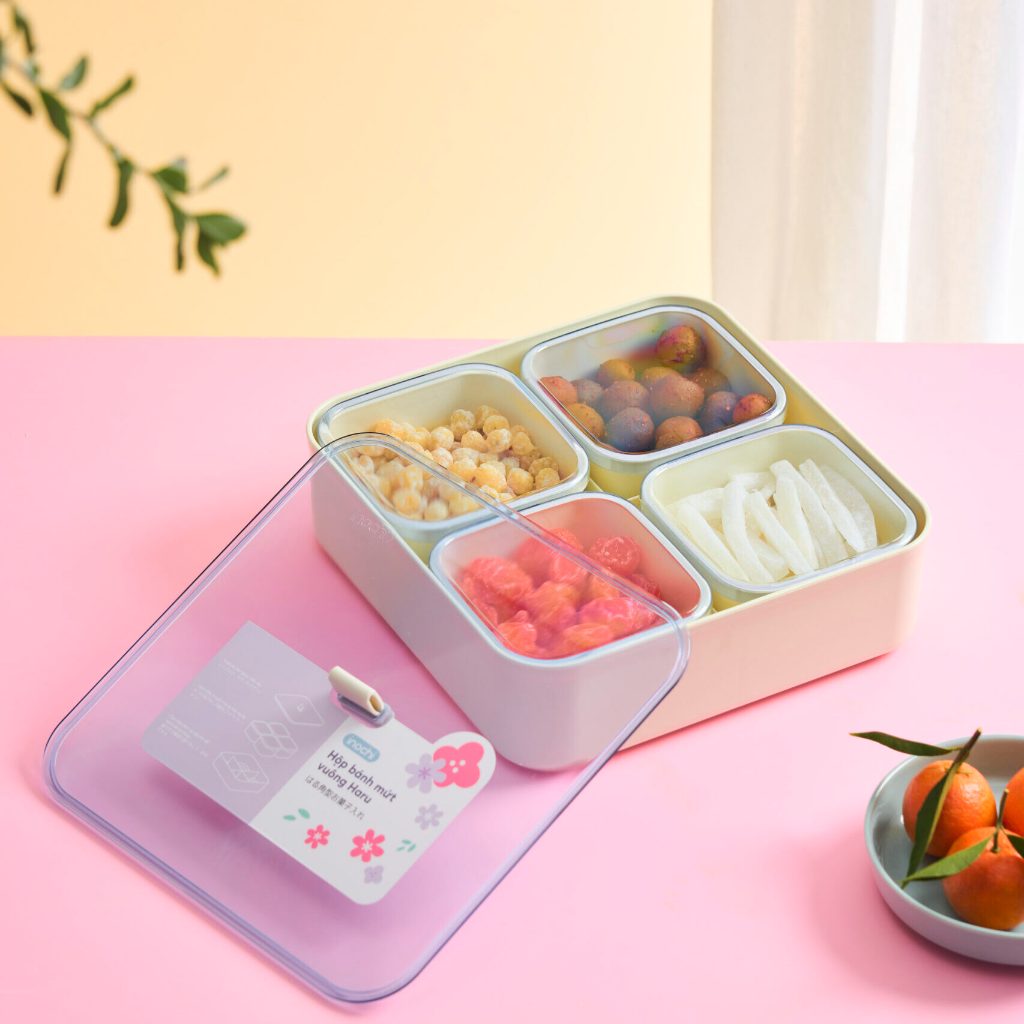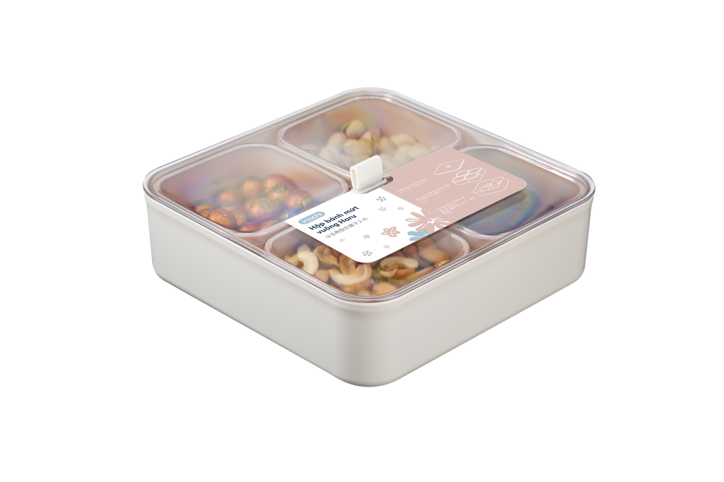 Hộp gồm nhiều khay nhỏ có nắp đậy riêng biệt, giúp phân loại bánh, kẹo, hạt dễ dàng và vệ sinh hơn. Nắp đậy khít, ngăn côn trùng và giữ thực phẩm luôn khô ráo.