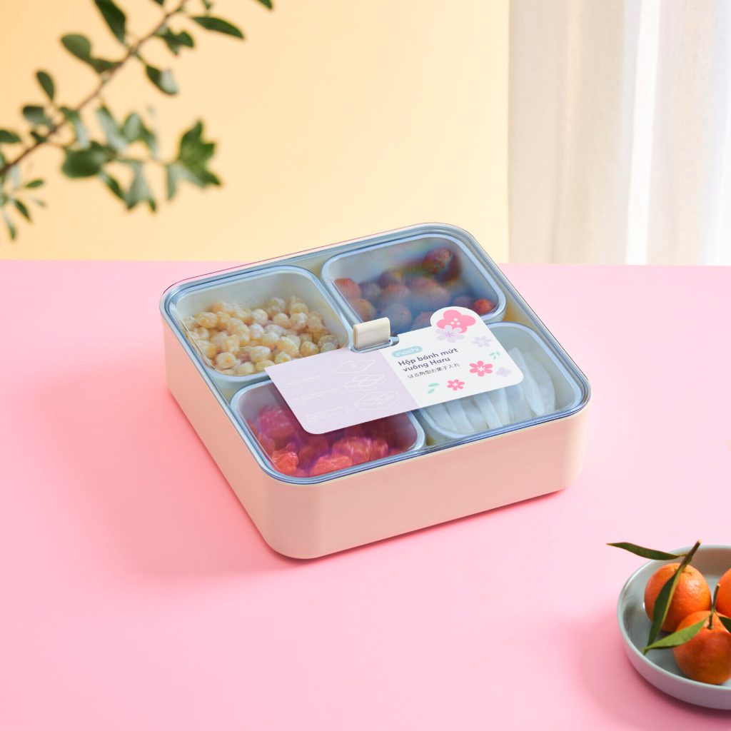Hộp bánh mứt vuông Haru: kiểu dáng vuông truyền thống, tiện xếp đặt